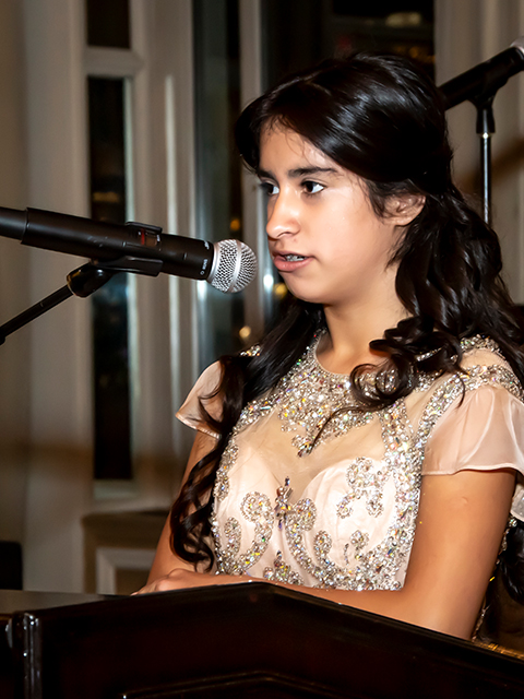 Anisa, whose story we shared earlier this year, was also in attendance with her mother. Looking absolutely stunning, she delivered an articulate and touching speech. We were so impressed with how beautifully she was able to speak in her second language at just 12 years old to a room full of adults. She thanked everyone for coming and introduced herself: