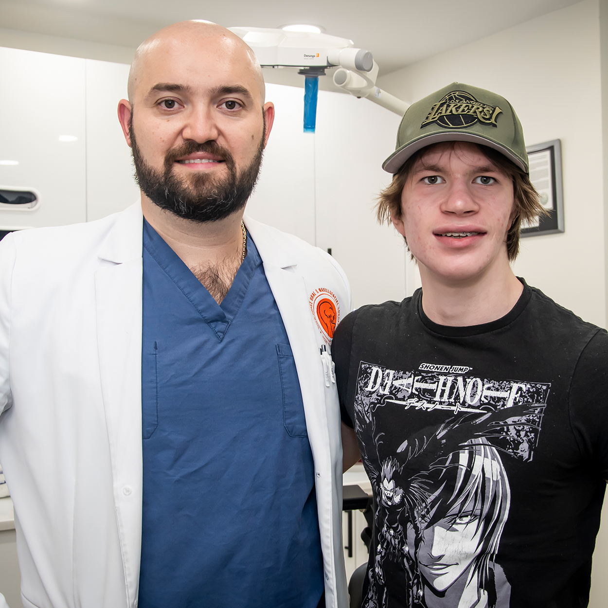 The first step in Dylan’s treatment plan was a complex double jaw surgery performed by Dr. Yusupov to even out his jaw. It was quite a painful recovery for Dylan, especially in the first two weeks, but he was determined and brave. He told us the worst part was not being able to eat solid food for the four weeks. But, he said, it was well worth it. He already felt more confident at this point in his treatment, including going outside and socializing, which had been difficult for him previously.