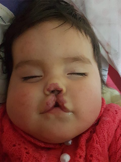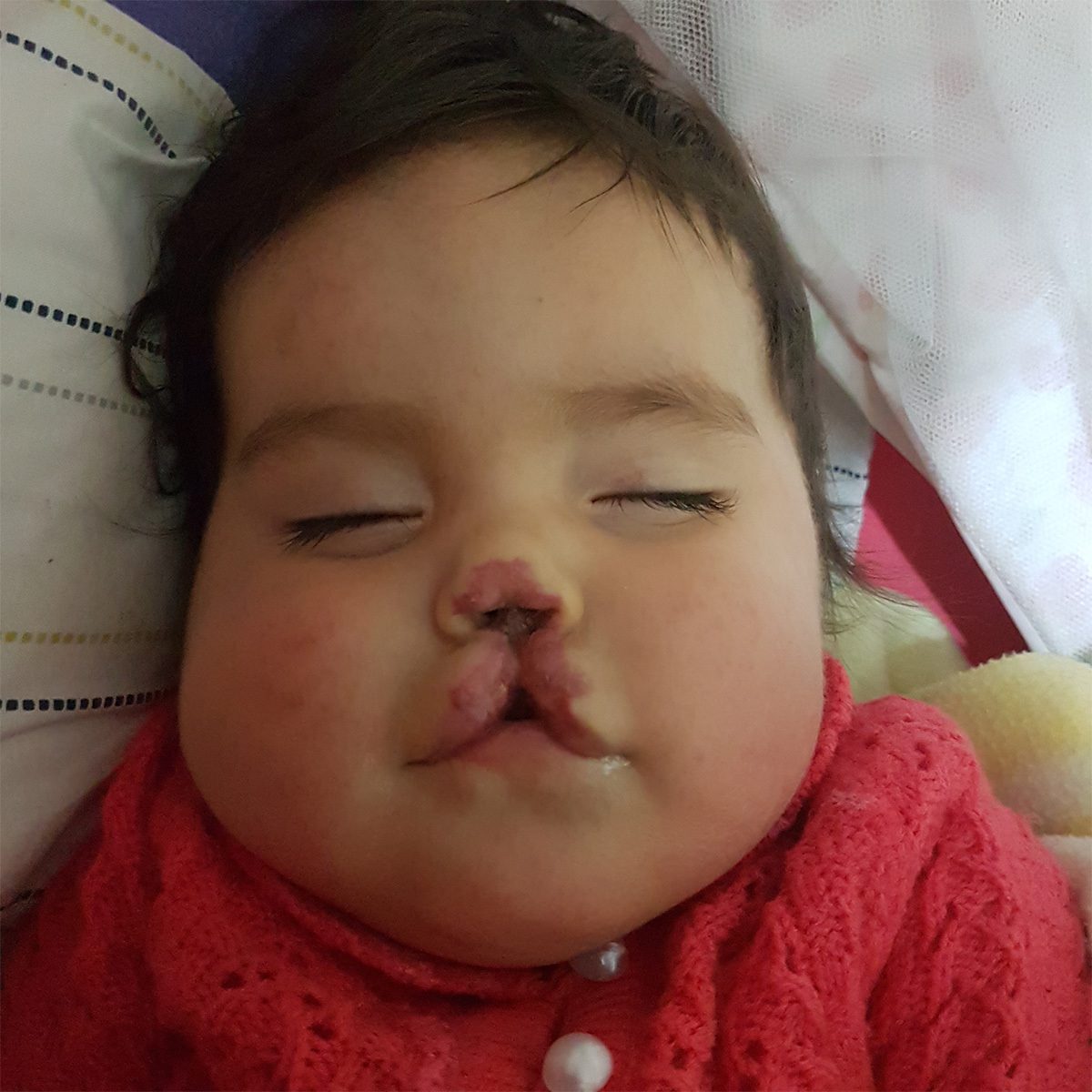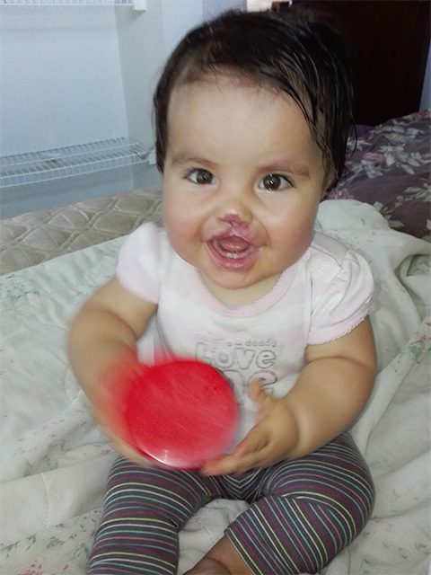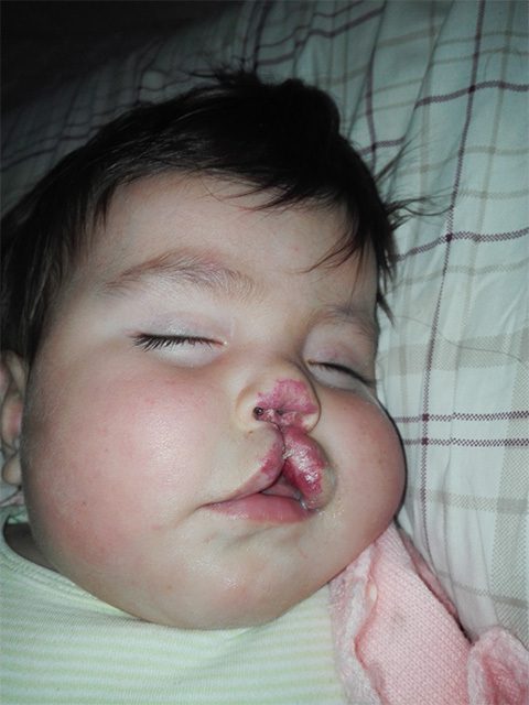 Maria was born with a red spot, a hemangioma, that covered her upper lip and the tip of her nose. She spent her first day of life in an incubator because she wasn't breathing correctly. At one week old, her hemangioma began ulcerating. At the beginning, the hemangioma was fairly small, but then the ulcer started to grow and covered her entire upper lip rapidly.